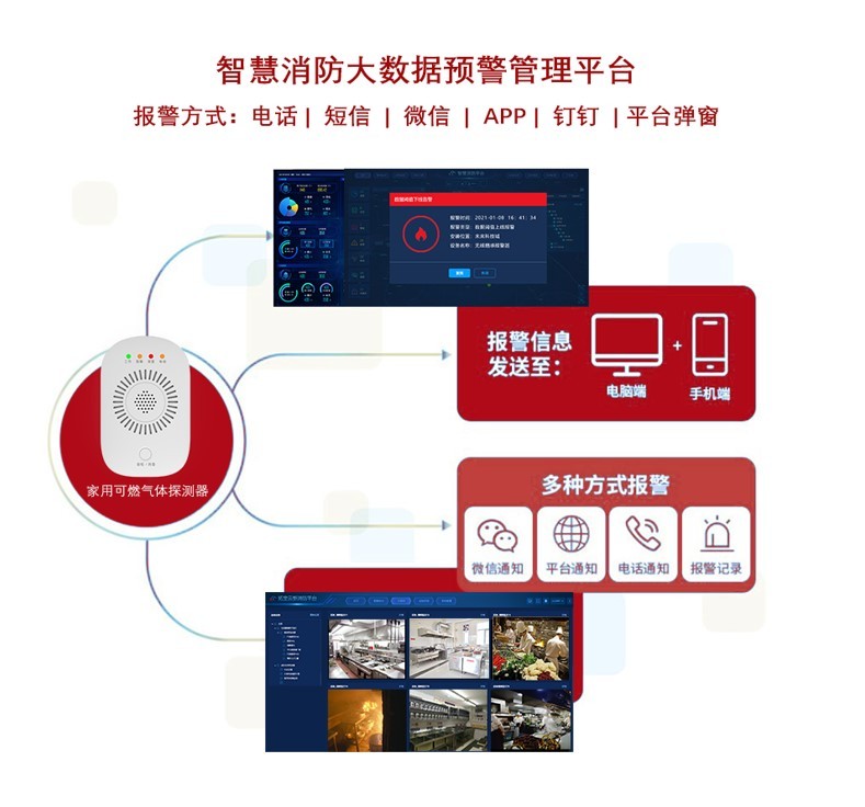 探测可燃气体(一氧化碳);实时设备状态监测,及时发现设备故障;多种报警方式(短信、微信、平台、电话等);1个接口可控制燃气紧急切断阀;1个接口可控制排风扇;简易壁挂式安装,简单方便。
